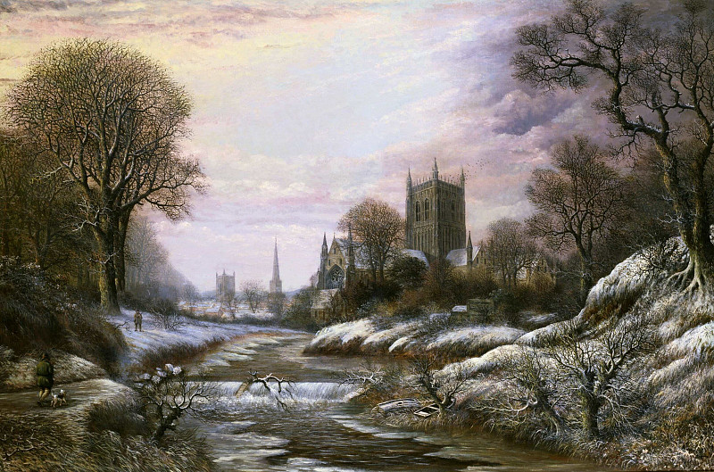 The surrounding environment contributes heavily to the overall mood. Large, bare trees frame the view on either side, their branches reaching skyward like skeletal arms. Their lack of foliage emphasizes the harshness and dormancy of winter. A stream, partially frozen over, reflects the overcast sky, adding a layer of stillness and melancholy. The ground is covered in a mixture of snow and fallen leaves, creating a textural contrast that further reinforces the season’s grip.