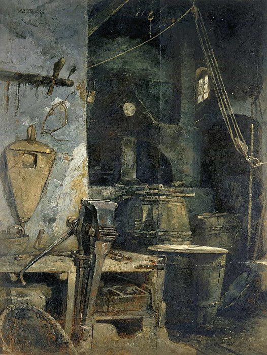 Beyond the literal depiction of a workspace, the painting evokes themes of labor, industry, and perhaps even the passage of time. The tools and equipment suggest repetitive tasks and the physical demands placed on those who work within this environment. The darkness and enclosure could be interpreted as symbolic of the challenges and hardships faced by industrial workers during the period. Theres a quiet dignity in the portrayal of these objects and processes, hinting at an appreciation for the skill and effort involved in their creation. The absence of human figures contributes to a sense of detachment, allowing the viewer to focus on the materiality and function of the space itself.