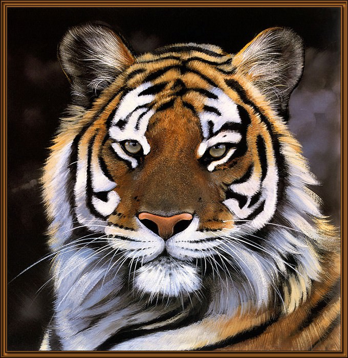 Perhaps it’s a painting of a leopard sitting on top of a tree branch in the middle of a forest filled with palm trees and a fallen down tree branch.