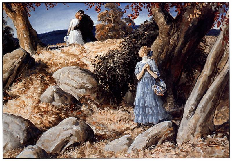 Perhaps it’s a painting of a couple of women standing next to each other in front of a stone wall with a dog on the other side of the wall.