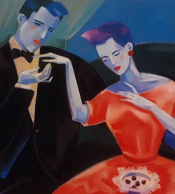 Perhaps it’s a painting of a bicyclist in a yellow shirt and black shorts riding a bike down a street with trees and buildings in the background.