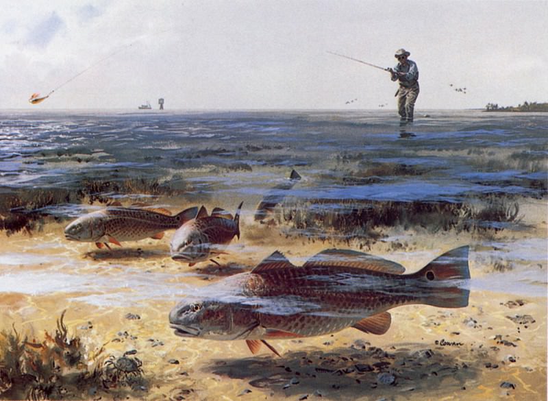 The arrangement of elements suggests more than just a straightforward depiction of fishing. The abundance of fish, their dynamic poses, and the clear focus on their pursuit of the lure imply an exploration of predator-prey relationships within this ecosystem. The lone fisherman, positioned centrally but somewhat distanced from the action, could be interpreted as representing humanity’s interaction with nature – a participant in a delicate balance.
