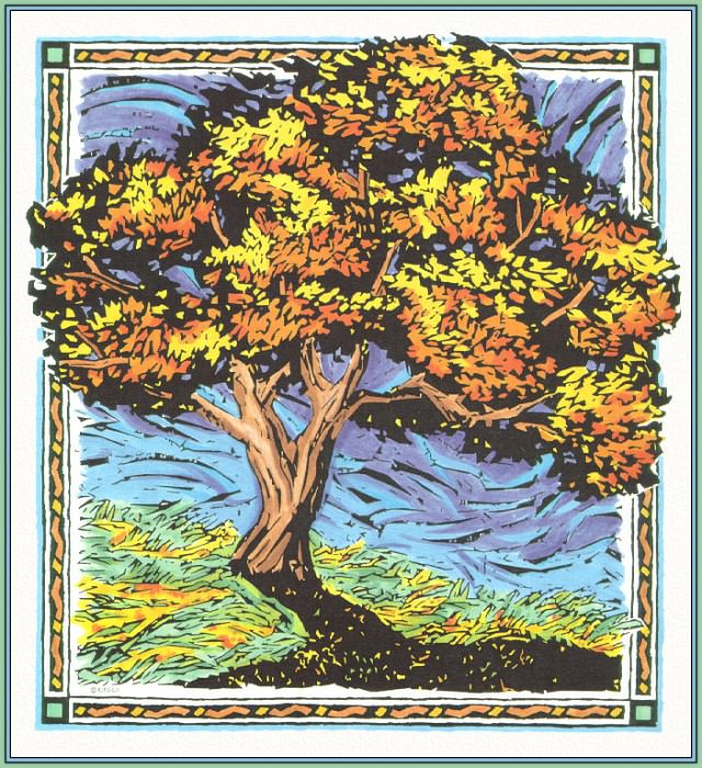 Perhaps it’s a drawing of a large pine tree in the middle of a field with pine trees in the background and a blue sky.