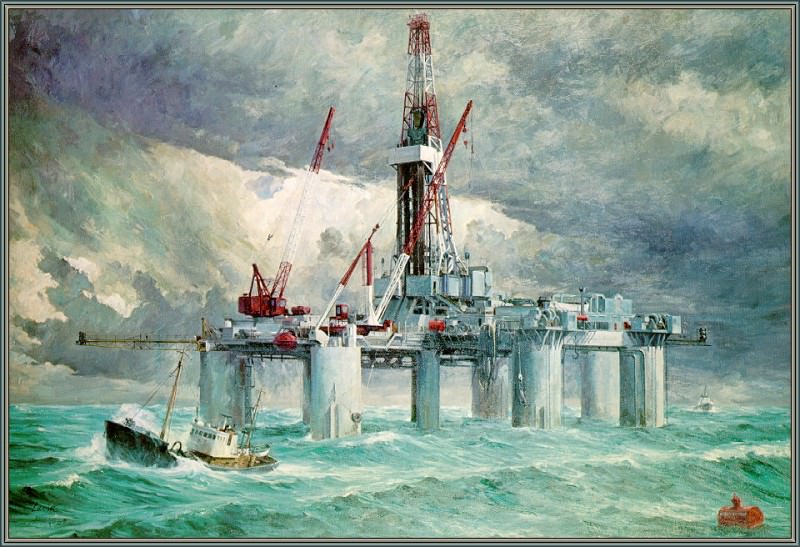 Perhaps it’s a painting of a group of people in a boat on a body of water near a pier with a helicopter flying over the top of the pier.