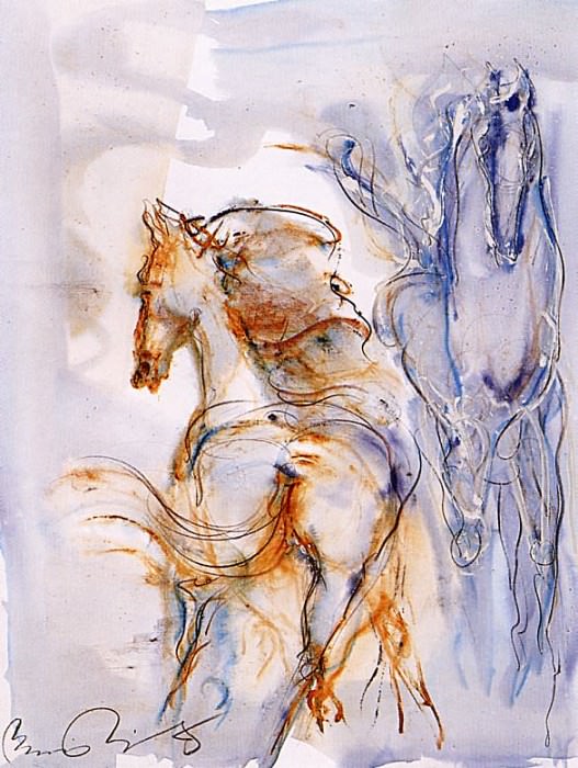 Perhaps it’s a painting of a group of horses with a man on one side of the horse, and a woman on the other.