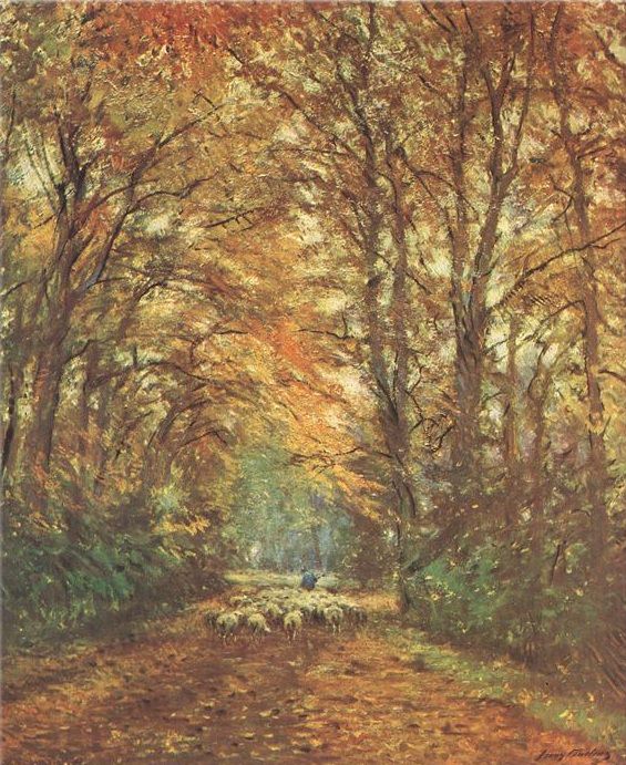 Perhaps it’s a painting of a group of people standing in the water in front of a building with trees in the foreground and a building in the background.