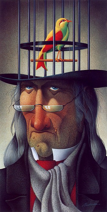The artists meticulous rendering of textures – the smoothness of the creature’s skin, the intricate detail of the birdcage, and the grain of the wooden pedestal – contributes to a sense of hyperreality, amplifying the unsettling nature of the scene. The work invites contemplation on themes of freedom versus captivity, aspiration versus limitation, and the complex relationship between desire and restraint.