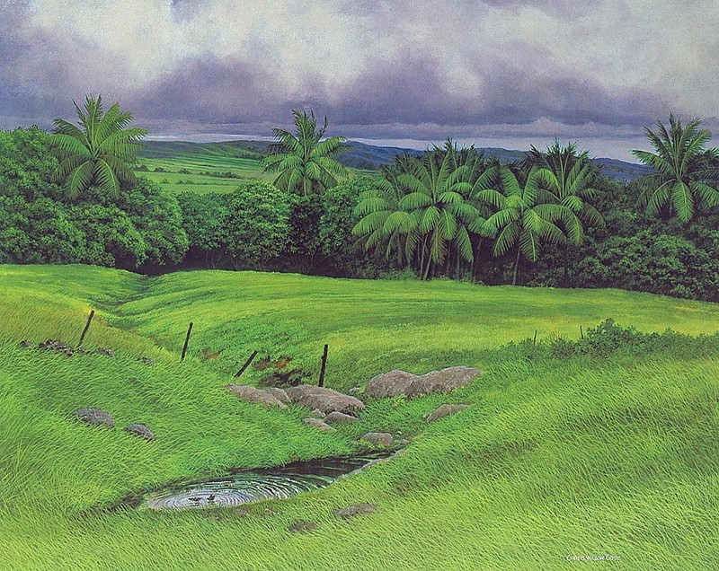 The foreground features tall grasses and reeds that partially obscure a narrow body of water – likely a stream or canal – which reflects the muted tones of the sky above. The water’s surface is relatively still, contributing to the overall sense of tranquility. A variety of trees are visible, including a prominent palm tree on the right side of the frame, further reinforcing the tropical setting.