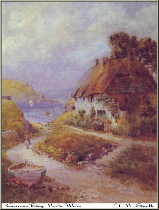 Perhaps it’s a painting of a cottage with a thatched roof and a woman and a child walking down a path to.