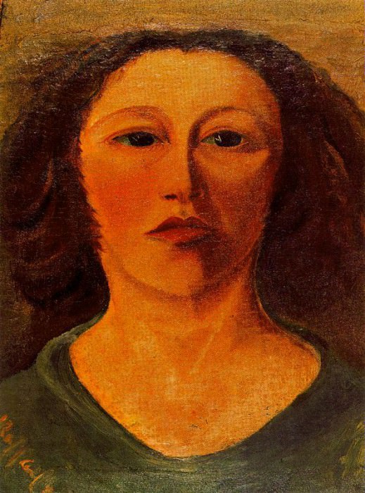 Perhaps it’s a painting of a woman holding a violin in her right hand and looking off into the distance with her left hand.