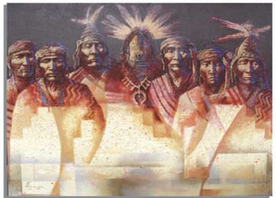 Above this tumultuous scene, a stark white bison skull is positioned against a background of textured gold and red hues. This placement immediately establishes a visual hierarchy, elevating the skull to a position of symbolic importance. The skulls bleached appearance contrasts sharply with the vitality of the living herd below, hinting at mortality and the cyclical nature of life and death on the prairie.