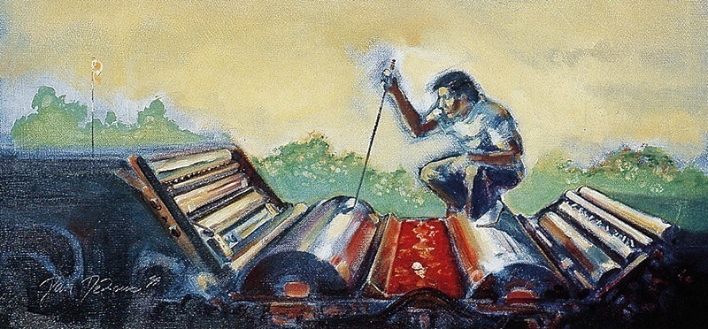 Perhaps it’s a painting of three horses with jockeys on their backs and on the back of the horses is a man riding on the.