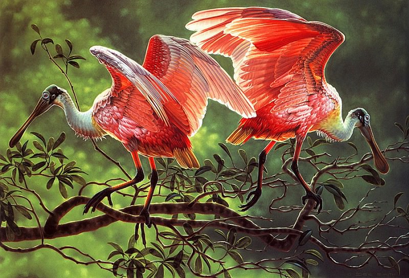 Perhaps it’s a painting of two white birds sitting on a tree branch in the middle of a body of water with a tree.